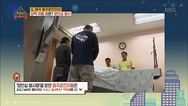 태국 정부는 2016년 4월부터 음주운전자들에게 영안실 봉사형을 시행하고 있는데요. 음주운전이 죽음과 밀접하다는 인식을 주기 위해 이 같은 제도를 마련한 것입니다. 영안사로 봉사형을 받은 음주운전자들은 영안실에 들어와 시신 앞에서 묵념을 한 후 영안실 청소는 물론 시신을 닦고 운반하는 일을 하게 된다고 합니다.