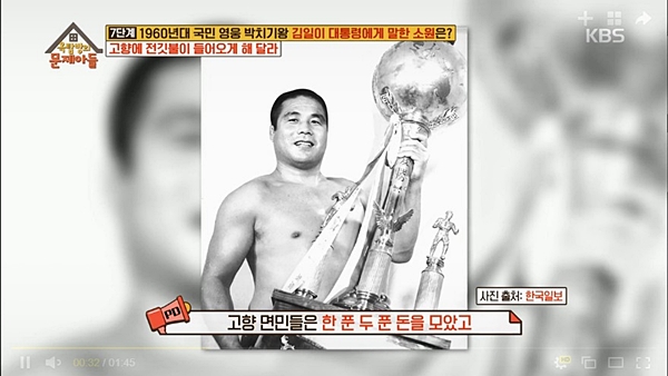 7. 맨손으로 호랑이를 때려잡는 사나이라는 별명을 가졌던 박치기왕 김일 선수는 1960년대 국민 영웅이었습니다. 당시 국민들에게 용기를 심어줬던 김일 선수에게 대통령은 무엇이든 좋으니 소원 한 가지를 말하라고 제안했는데요. 김일 선수가 당시 대통령에게 말한 소원은 무엇이었을까요?