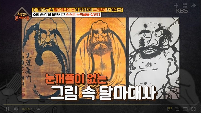 6. 액운을 쫓는다고 해 한때 집안에 많이 걸어놨던 달마도는 불교 선종의 시조 달마대사인데요. 다양한 그림 속 달마대사에게는 한 가지 공통점이 있습니다. 모두 무서울 정도로 두 눈을 부릅뜨고 있다는 건데요. 그렇다면 달마대사의 눈이 부리부리한 이유는 무엇일까요?